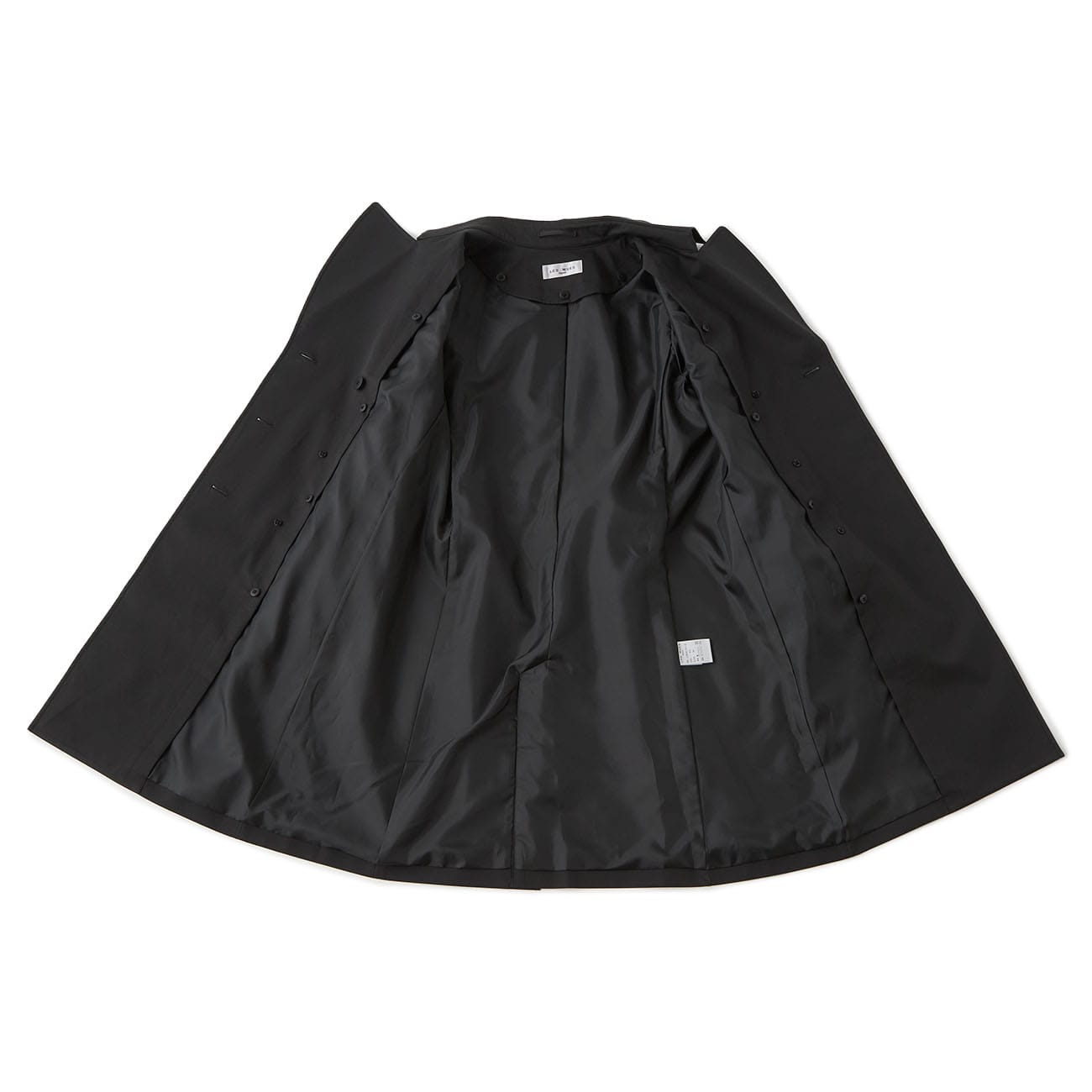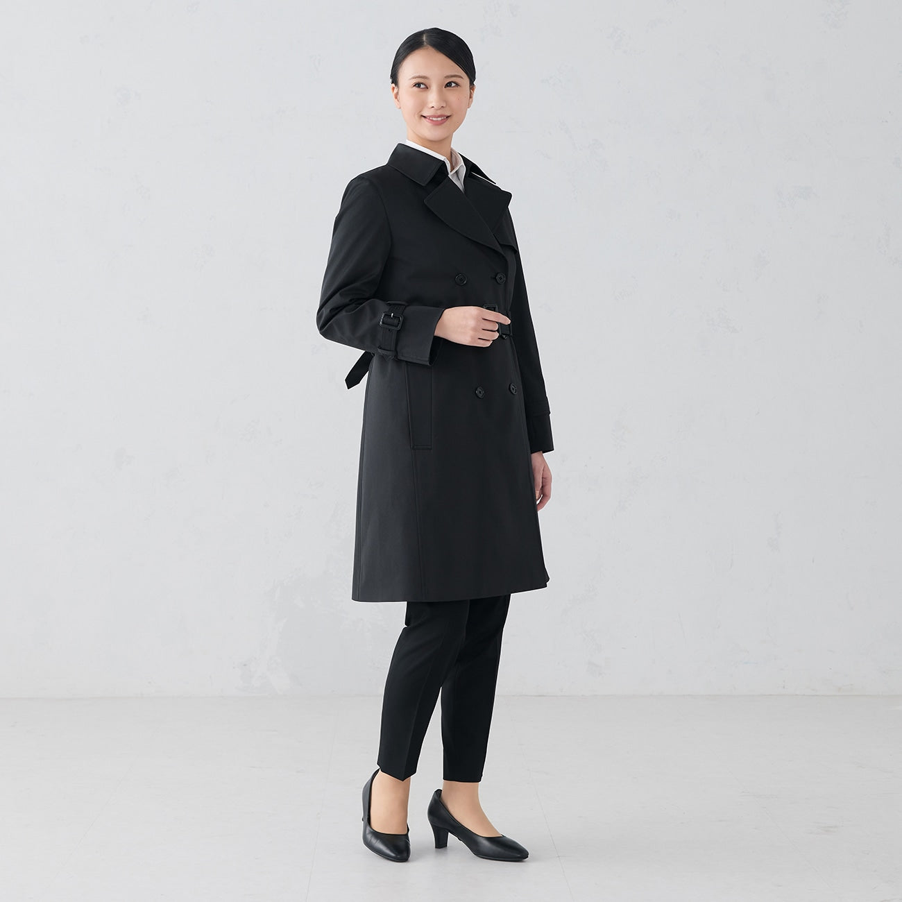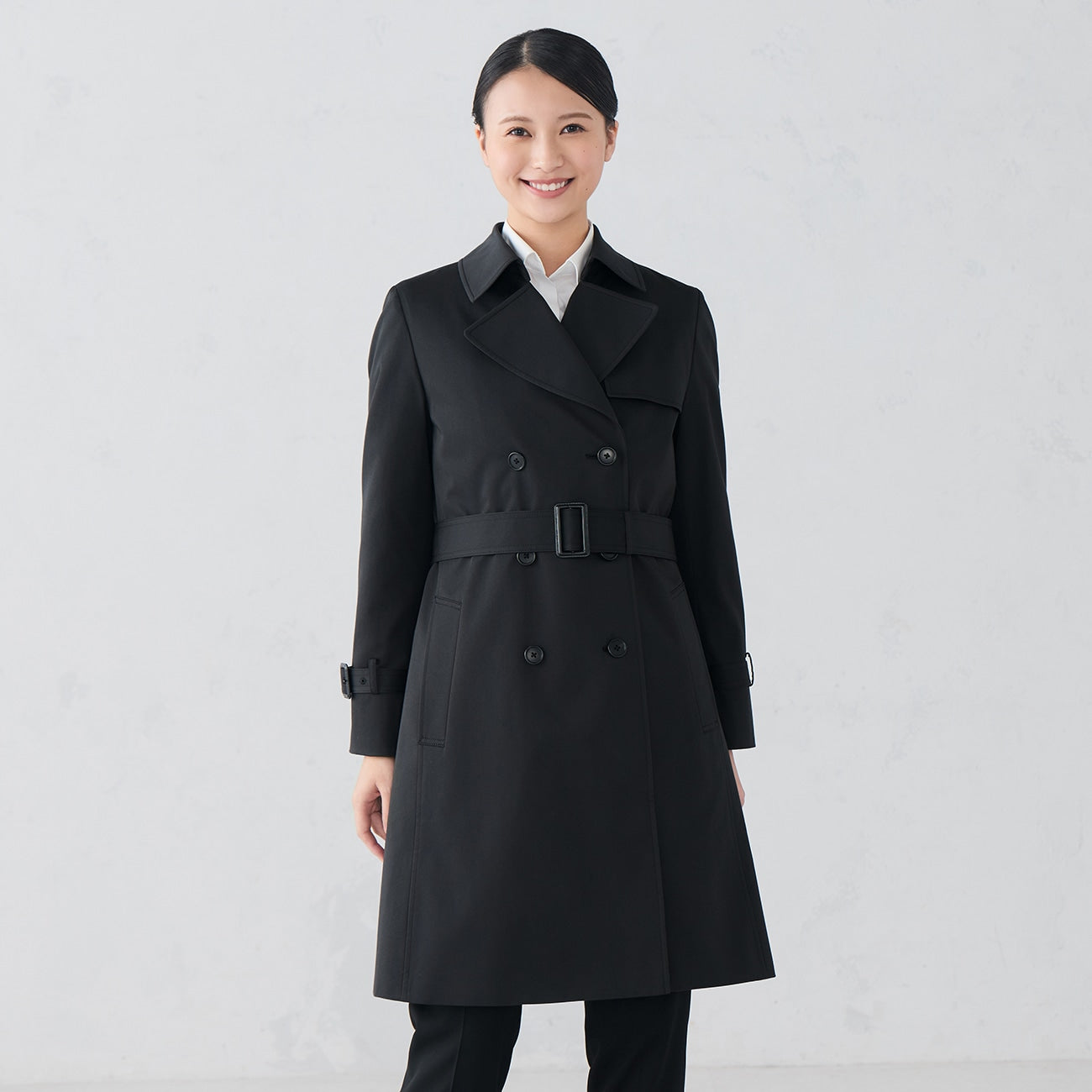 Creates a mature looseness by loosening the waist squeeze dare. The collar is designed to be moderately large, expecting a happy small face effect. Placing the front 6 buttons at a high position guides the eyes upward, naturally fulfilling leg-lengthening and style-up effects.