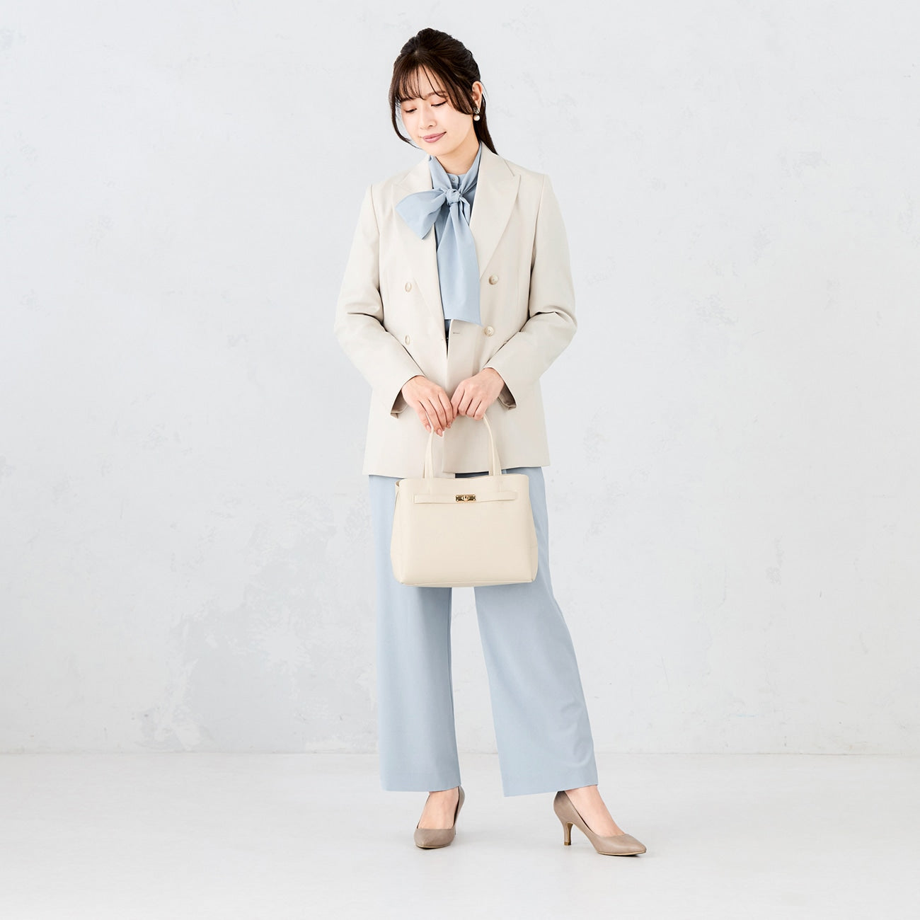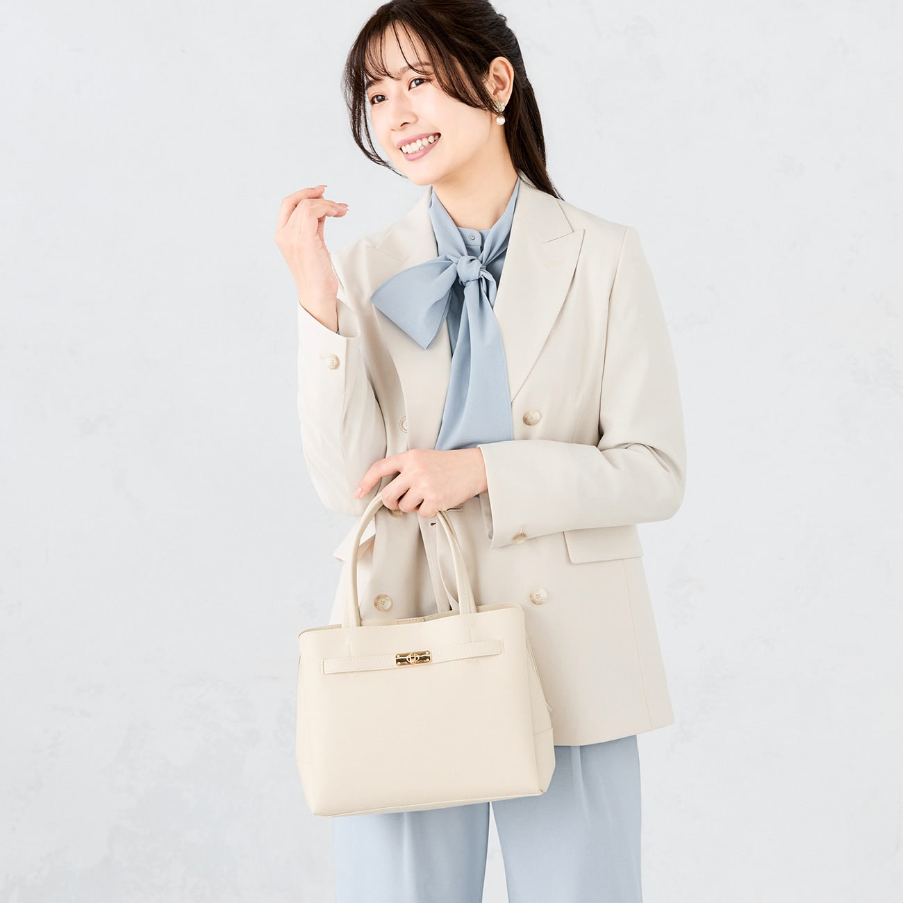 Square form with a sense of properness. Front belt & turn lock metal fittings add luxury. Excellent item that matches widely from suit style to holiday clean coordination and occasions.