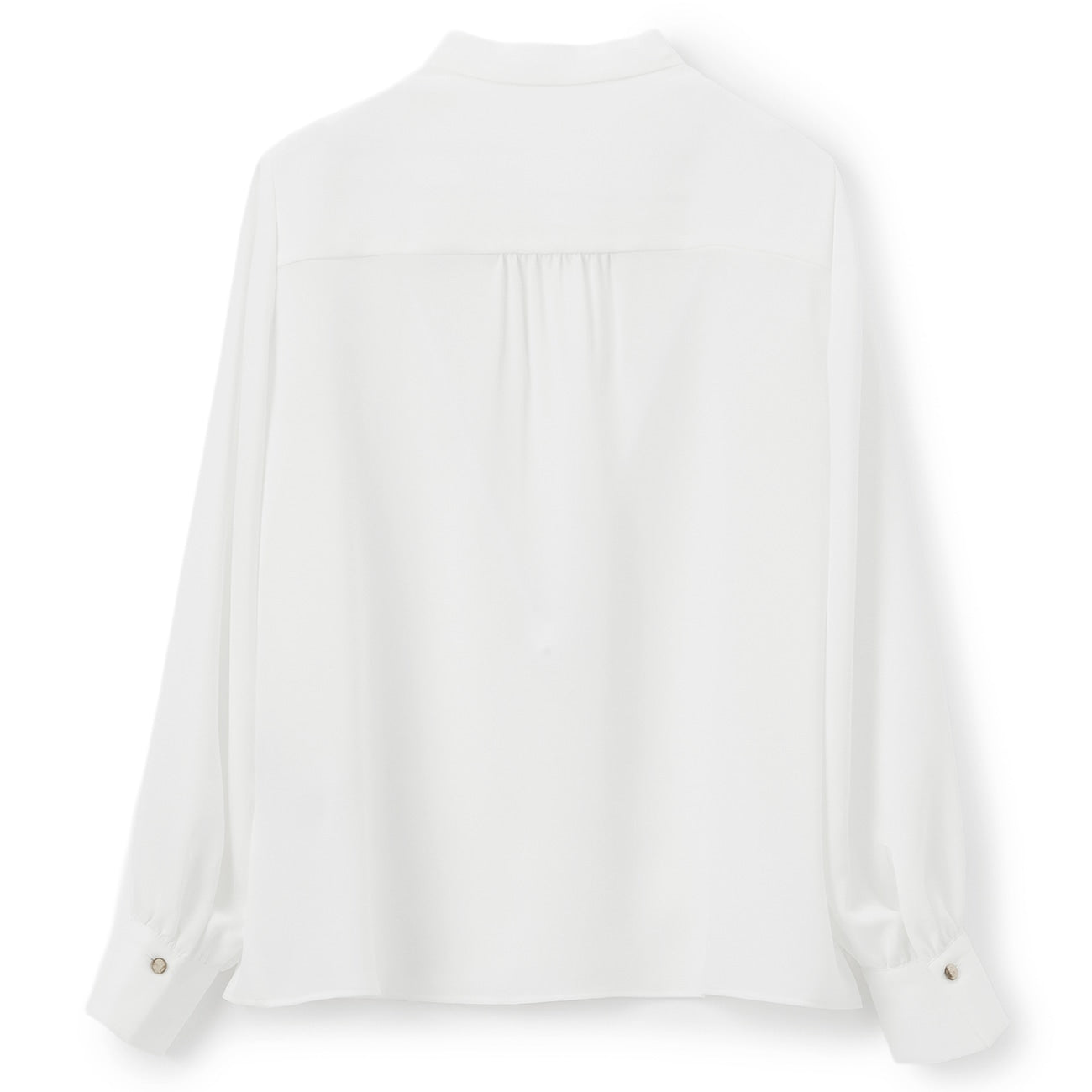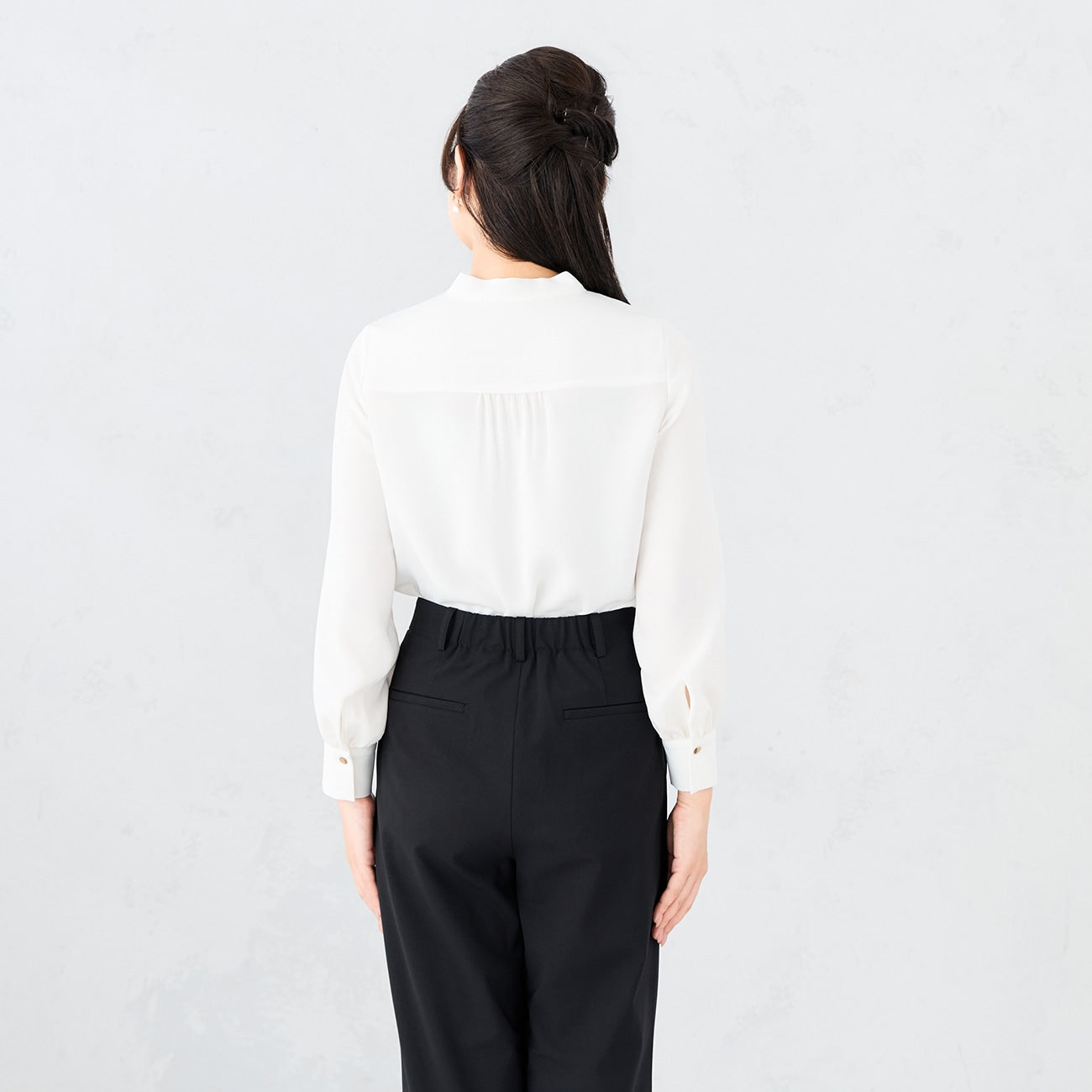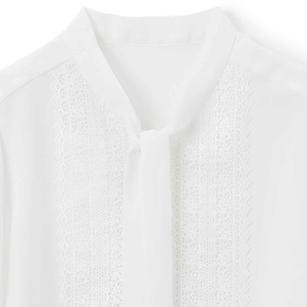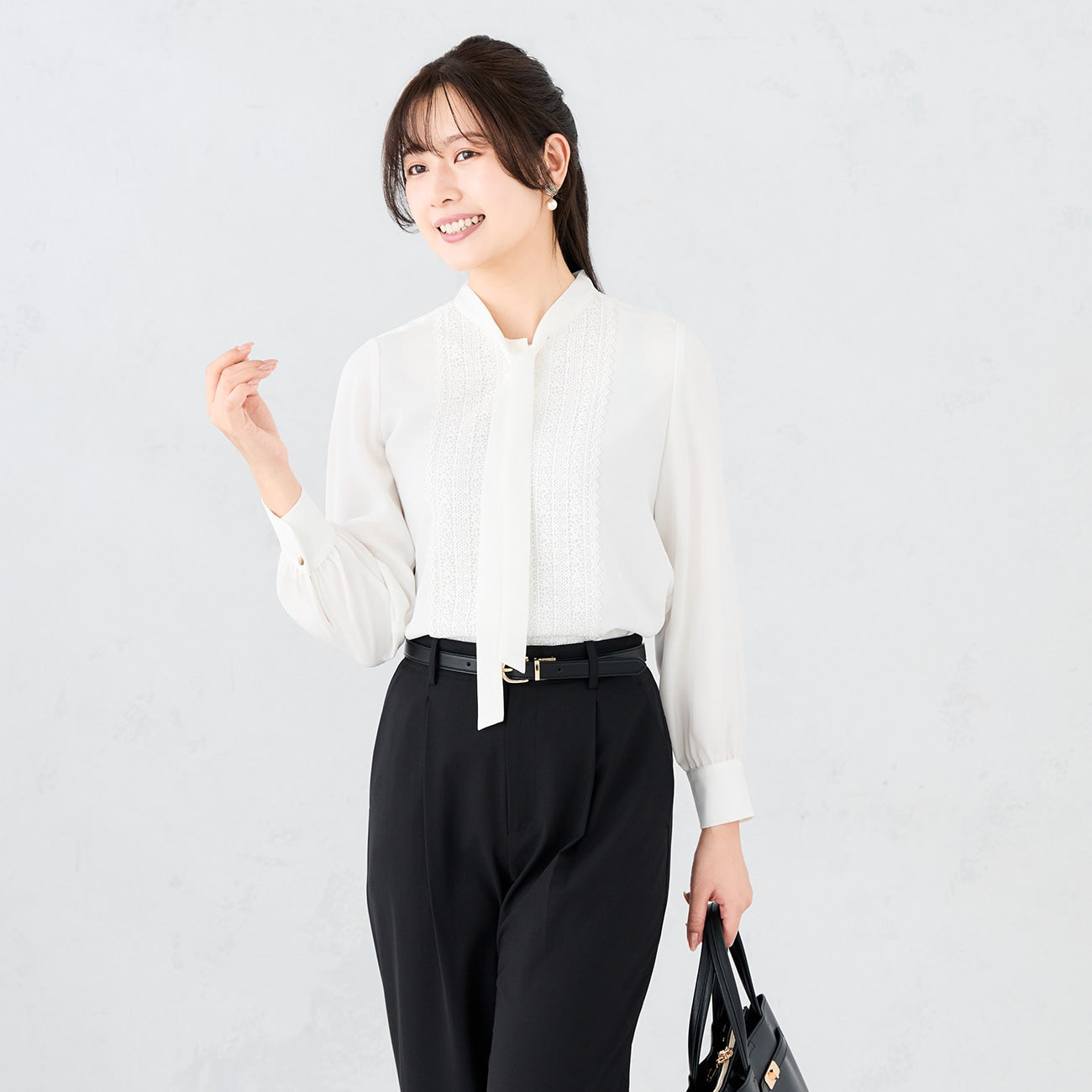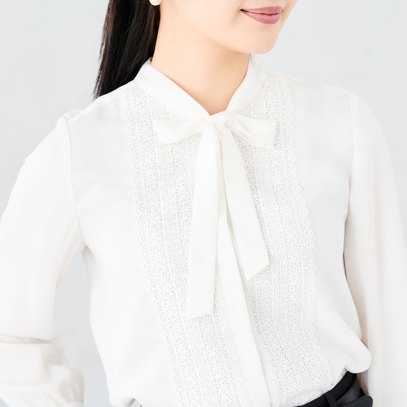 Elegant sheer feeling and lace use brighten and color gorgeously around the face. Even when wearing a jacket, the lace peeking from the chest enhances the sense of class. The freely arranging bow tie changes its expression according to the scene and always fulfills the ideal style.