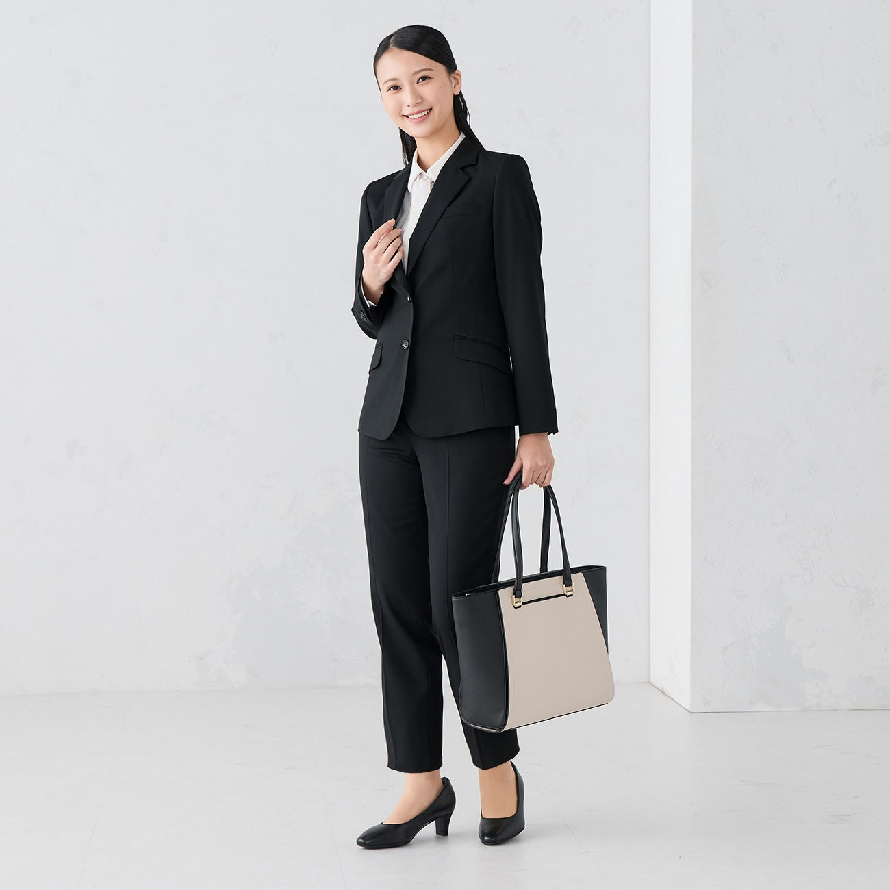 衣身與袖口珍珠扣細緻典雅。衣長設計恰到好處,露出下擺也顯得俐落有型。