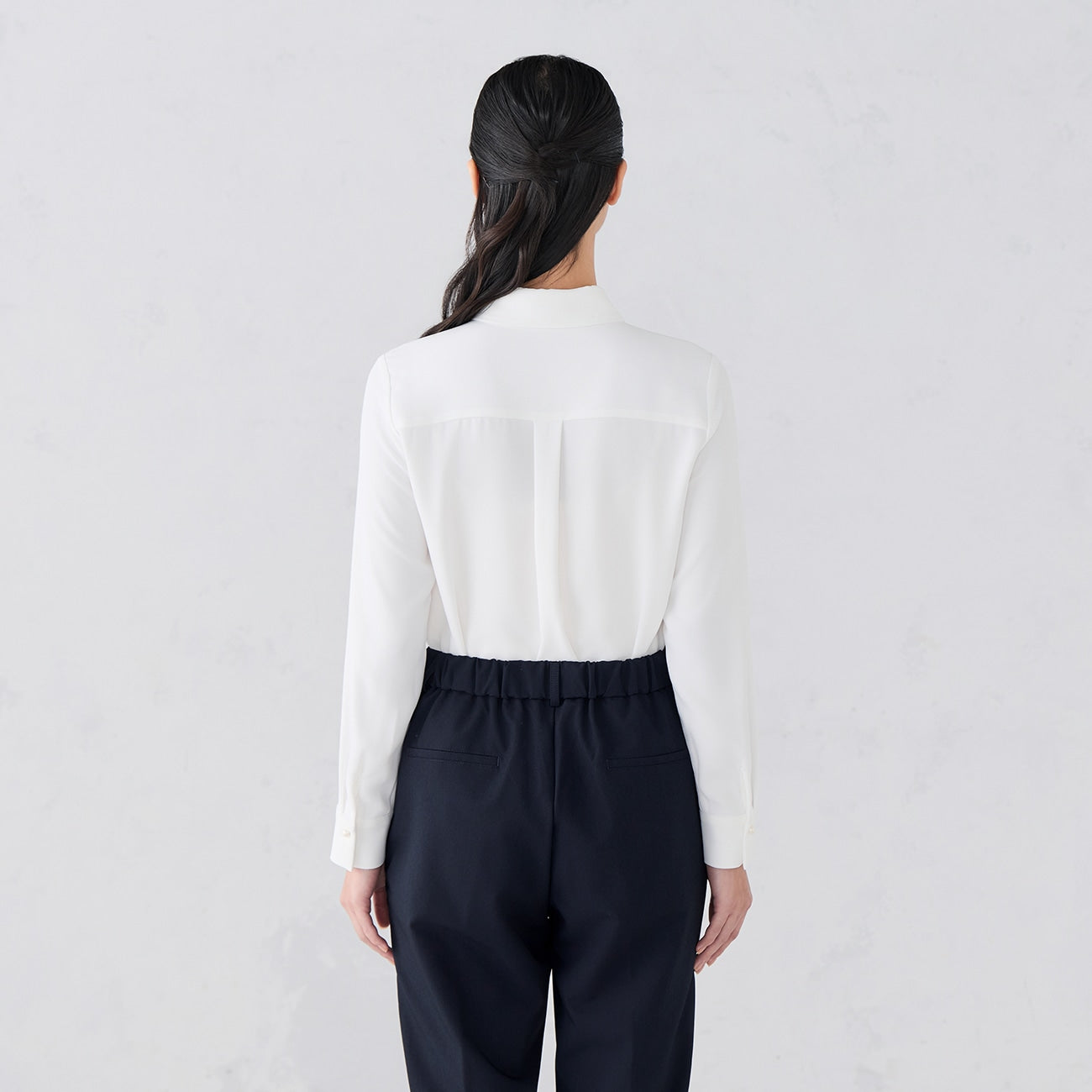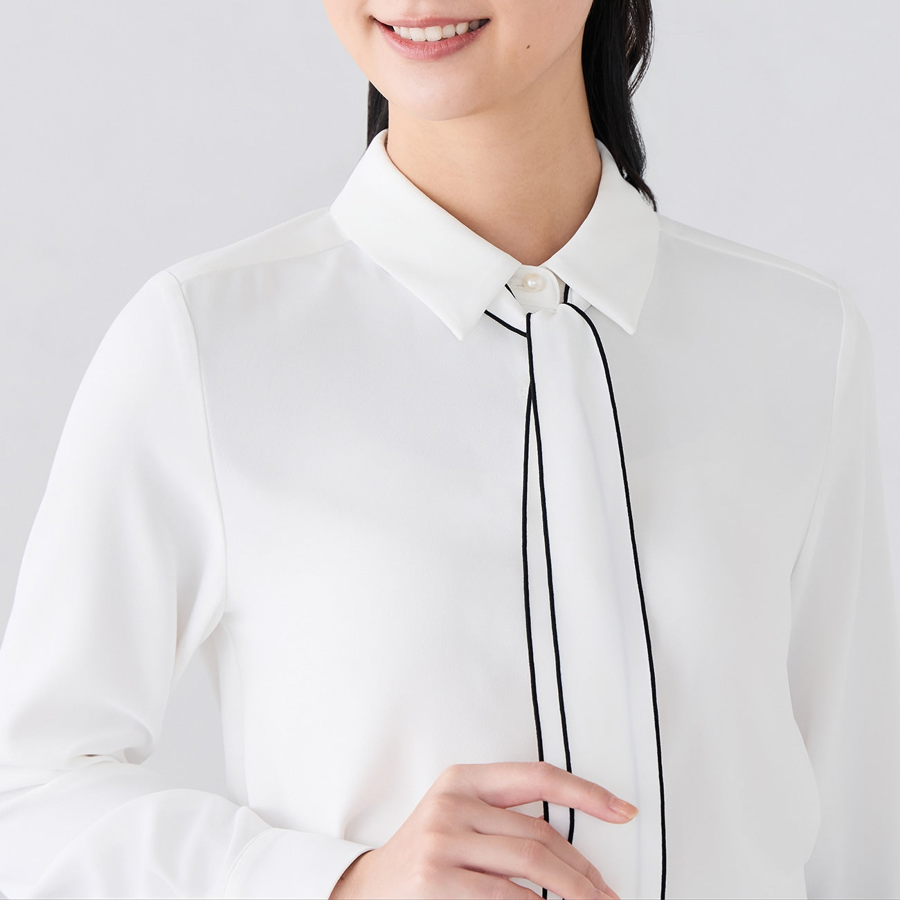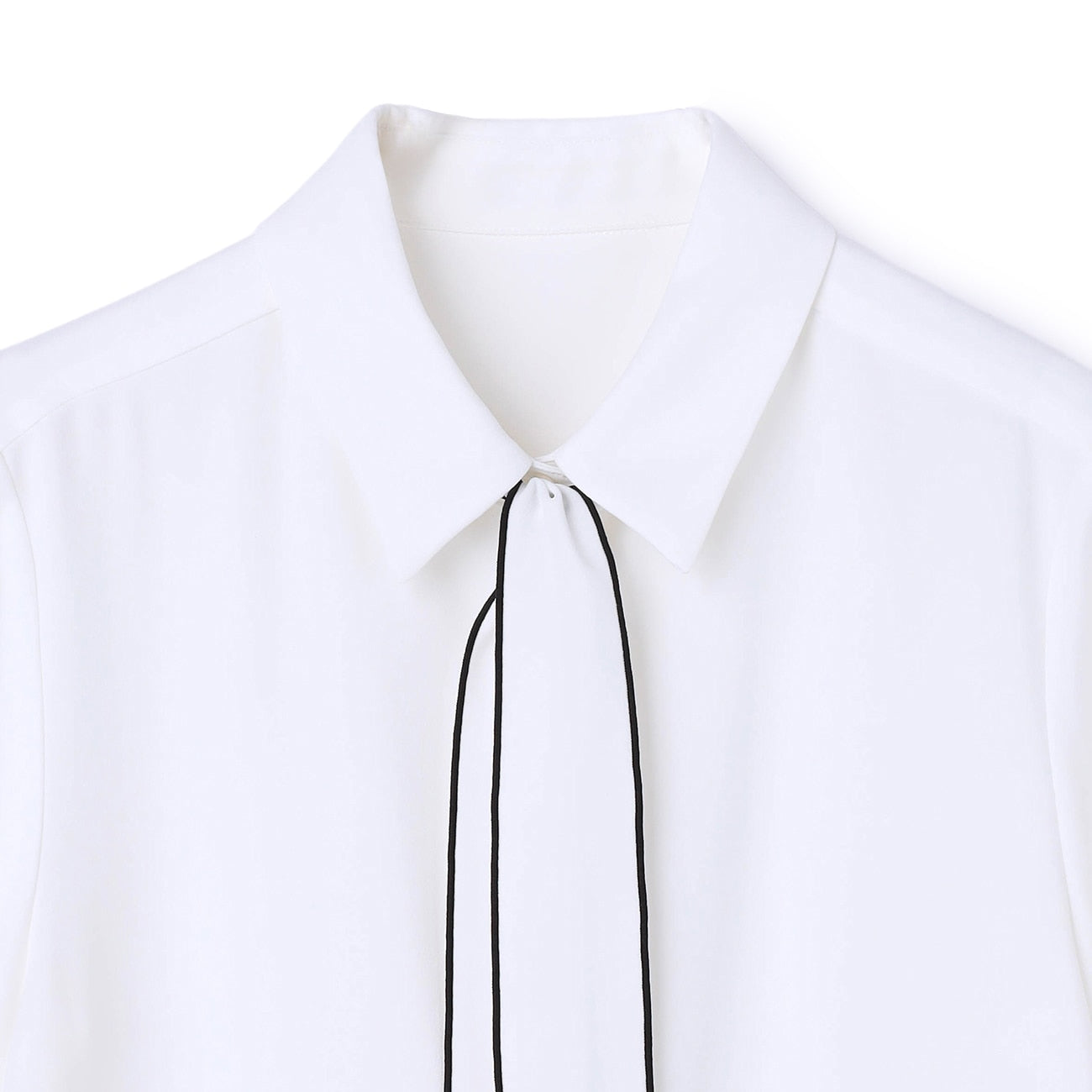 領結自然垂墜營造領帶風格,繫上展現優雅華麗,亦可拆下領結作為素面襯衫穿著。
