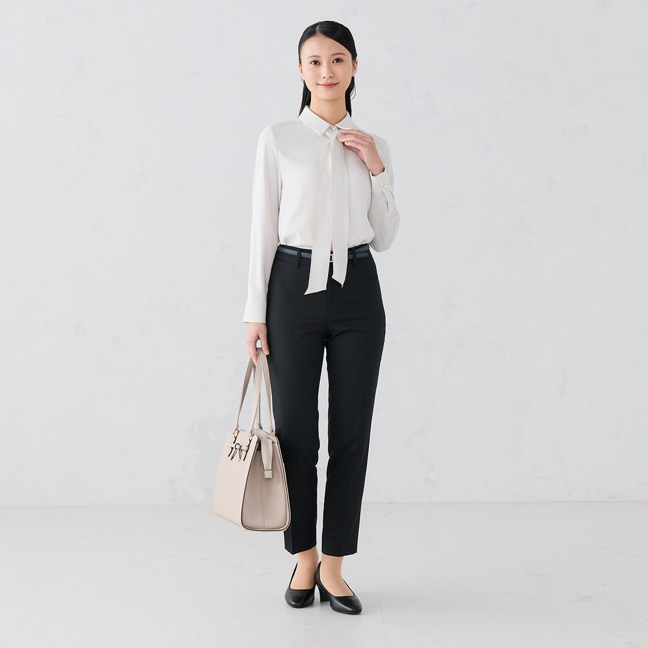 Detachable bow-tie is 2way specification that can be easily changed with button. Cool tie style is perfect for office wear. Gorgeous ribbon knot makes it gorgeous at once and gives cute impression. Simple regular collar blouse if you remove all bow-ties.