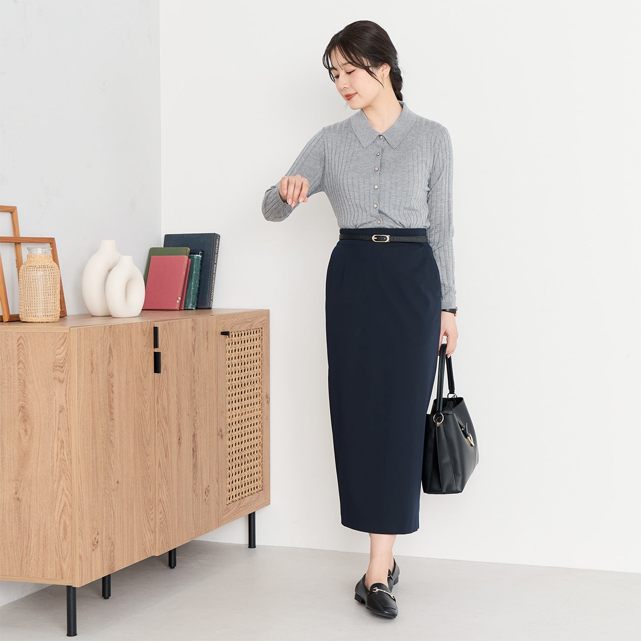 使用半梳毛羊毛,蓬松柔软,混纺丝线增添些许光泽。立体剪裁适度修身,穿着不紧绷。