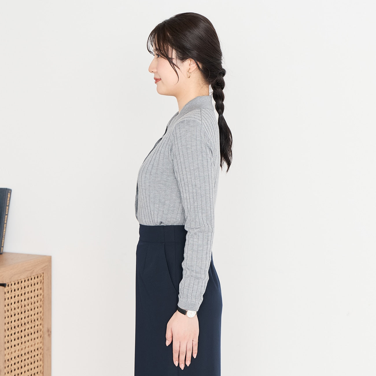 一款优雅针织衫 。金色纽扣为罗纹设计增添点睛之笔,完美适配商务与休闲场合。