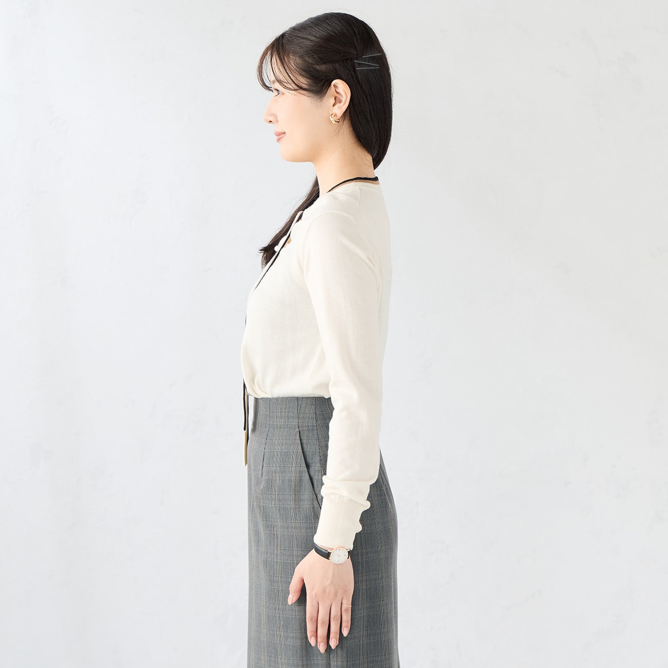 采用柔软蓬松的半精纺羊毛纱线。混纺面料呈现优雅色调,缀以丝绸特有的细腻光泽,搭配迷人的对比色蝴蝶结领带。