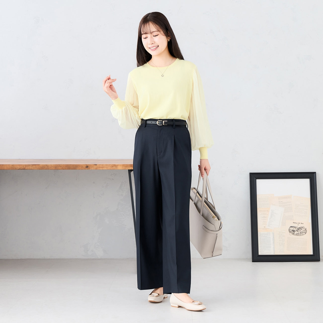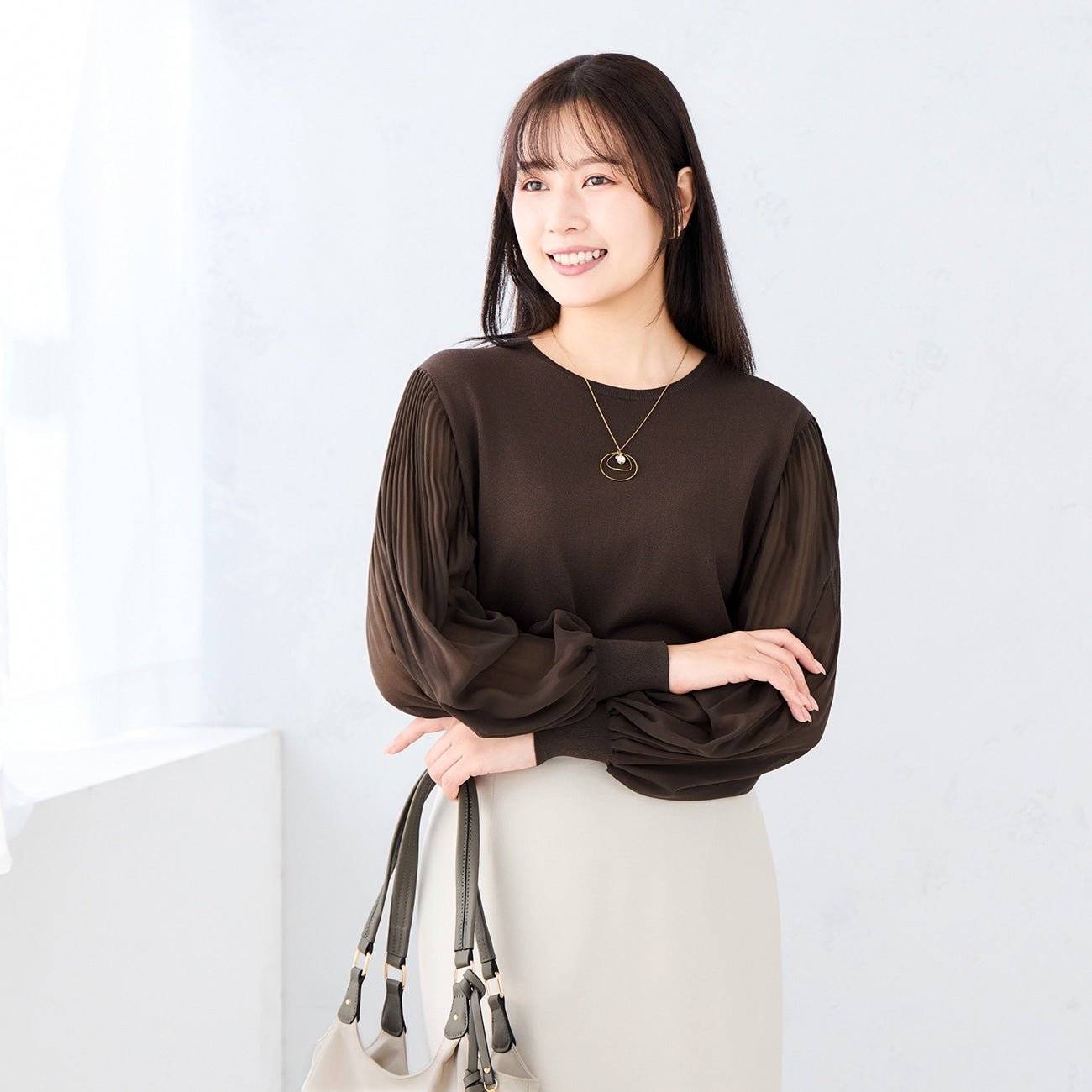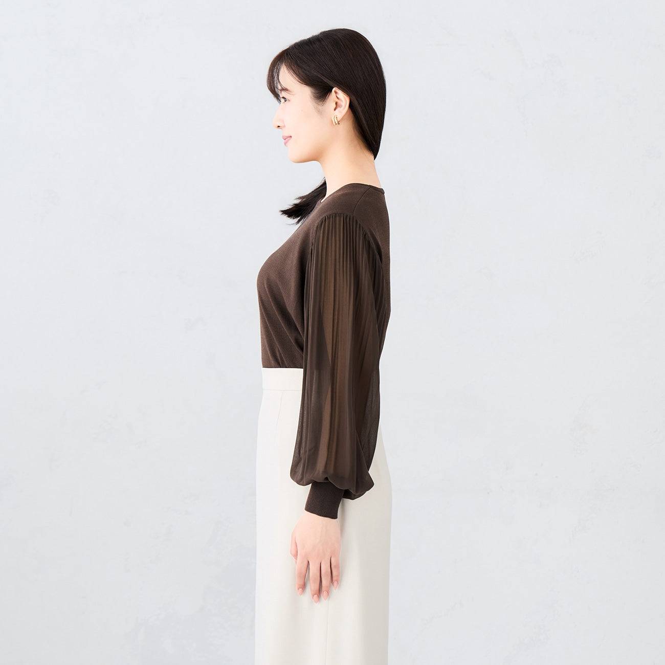 彈性簡約針織衣身,搭配雪紡百褶袖,修身同時打造穿搭亮點。