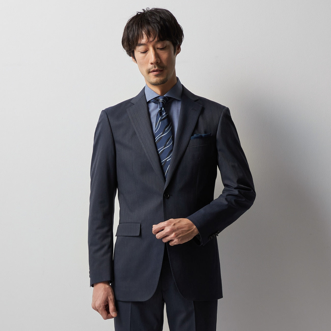 ・西裝外套:2顆鈕扣、背開中叉、袖口假扣眼、半內裏。西裝褲:無摺。