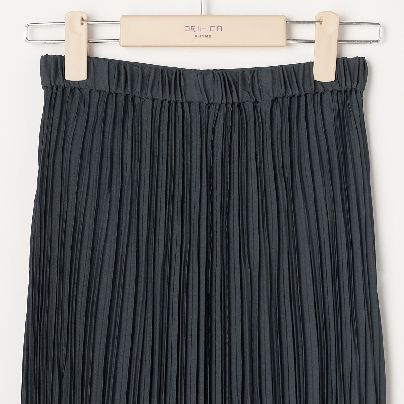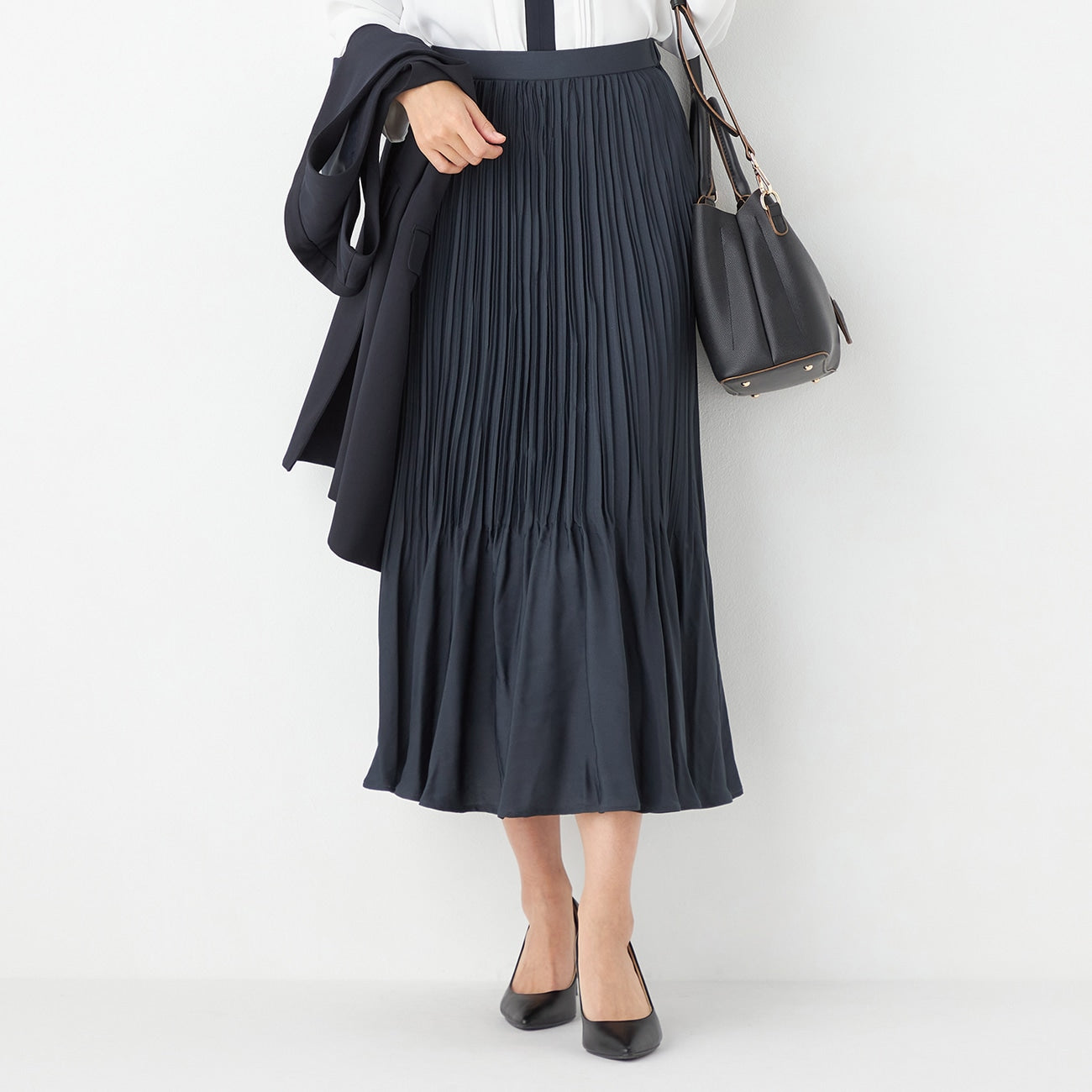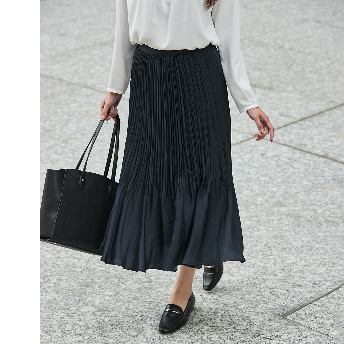 - Pleated skirt with light material creates a vertical line for a style-up effect.
