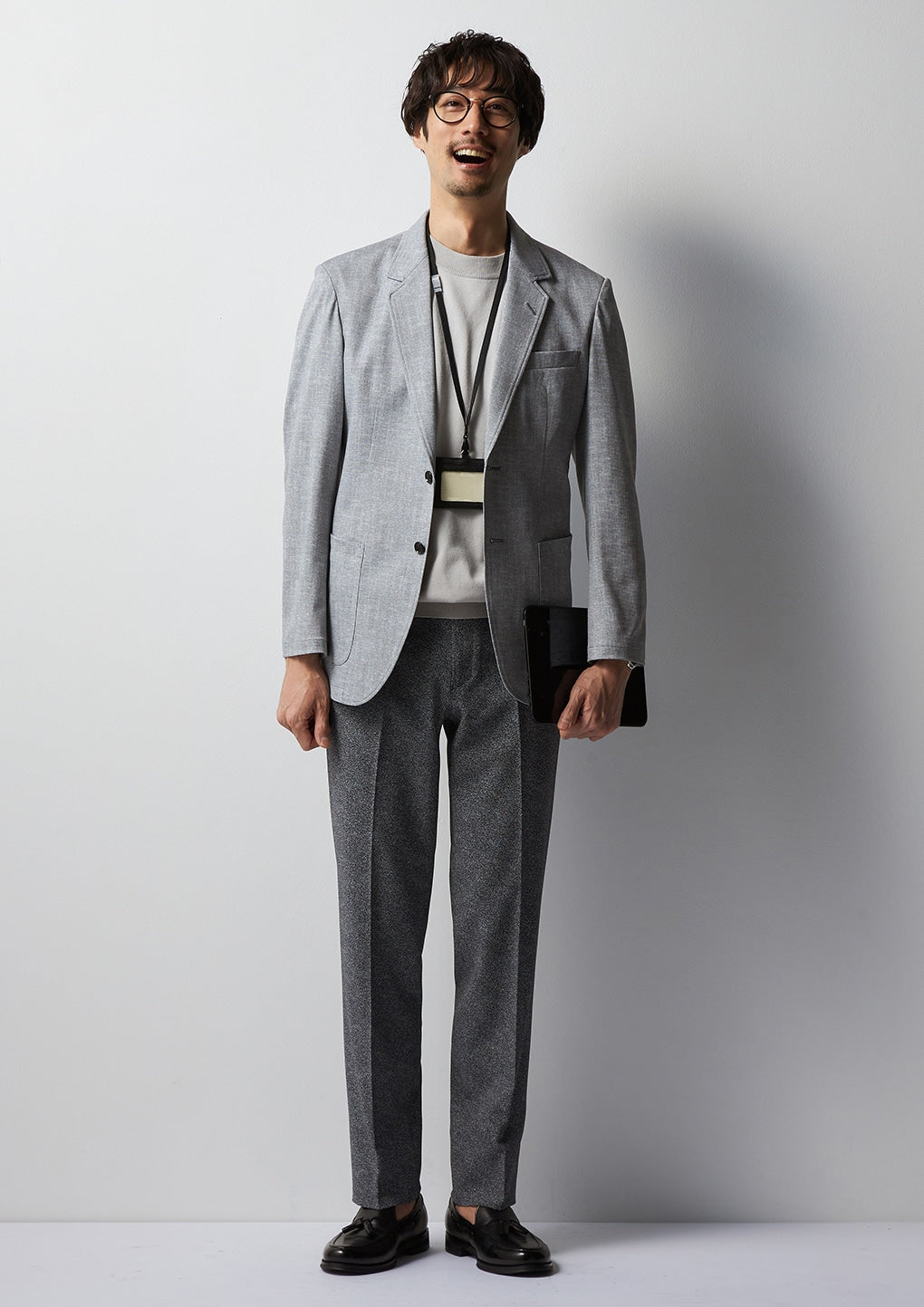 ・西裝外套:2顆扣子、無開叉、直筒袖、無內裏、貼袋設計。