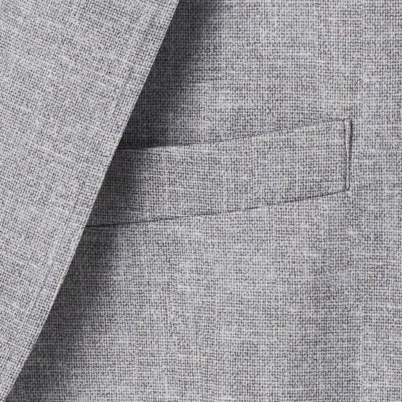 - 2-button closure, no vent, plain sleeves, unlined, patch pockets.
